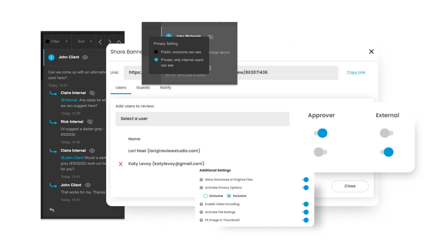 One approach that ReviewStudio has always offered for addressing this separation of “internal” and “external” review cycles is to maintain two distinct Reviews for each project – one that is only shared with the internal team and another one that is only shared between a client and account manager for external feedback. While this approach has the benefit of maintaining a clear separation, it has the disadvantage of requiring an ongoing process of synchronizing the file versions and feedback between two reviews – a manual process that is time-consuming and can also be prone to error.